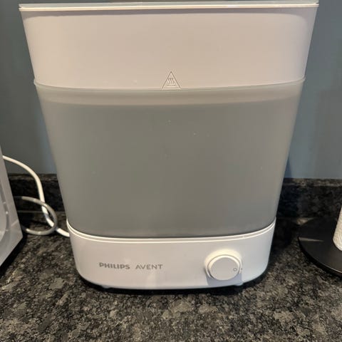 Sterilisator til seks flasker og utstyr. Medfølger melkeoppbevaring om det er ønskelig.