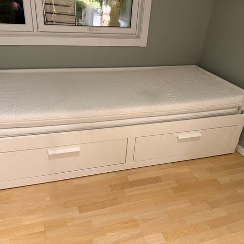 IKEA brimnes dagseng. Har noe bruksmerker men er ellers hel og i god stand. Må hentes. Sengen er ikke demontert og kan fraktes ut i to deler. Se bilde for mål.