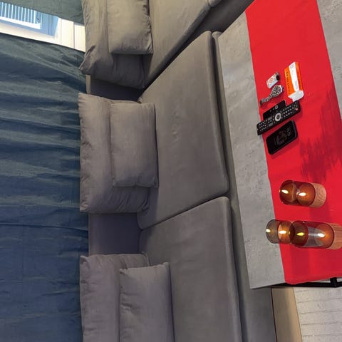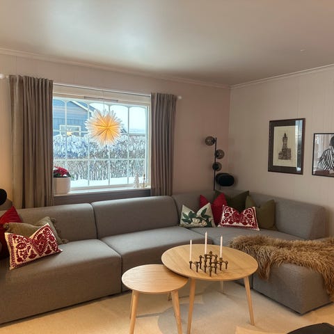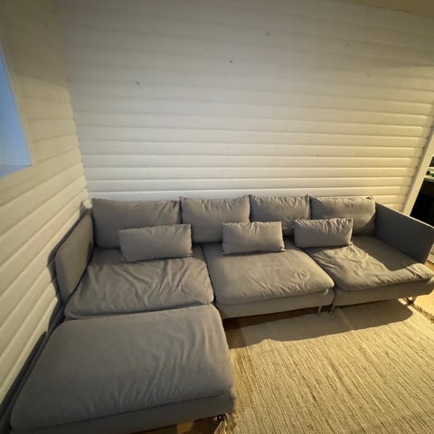 Grå SÖDERHAMN Hjørnesofa, 4-seters fra Ikea selges. Kjøpt ny i juli 2022. Se bilder for mål. Ingen skader på sofaen. To merker på to puter, men de kan helt sikkert vaskes bort med møbelrens. Kjøper må hente og demontere sofaen. Dyrefritt hjem.