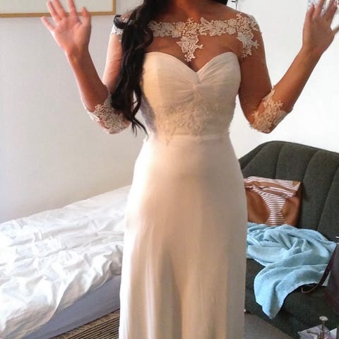 Brudekjole str 38 med snøring bak. Fra ski brudesalong. Langt slør følger med samt underskjørt. Kjolen er noe slitt nederst, men vanskelig å se på grunn av alt stoffet. 4500kr.