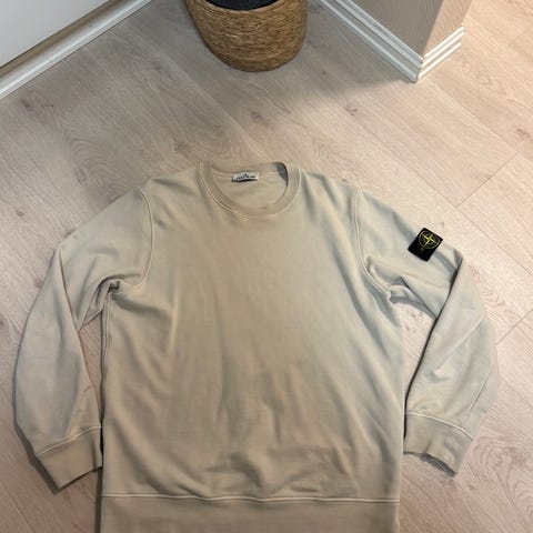 Stone island crewneck grå kjøpt ny på mark+brandy des 2023. Har fått en flekk på brystkassen. Ikke sett flekken tidligere så har ikke gjort så mye for å vaske den bort så usikker på hvordan flekk det er. Genseren er str xl