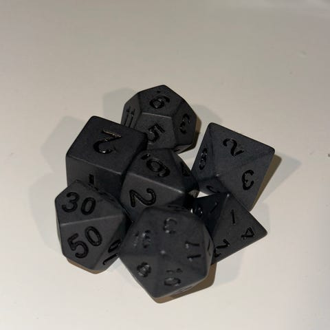 Sett med 7 terninger i flerfarget grønt design. Terningene har ulike antall sider og er egnet for brettspill og rollespill. Brukt til Dungeons and Dragons.