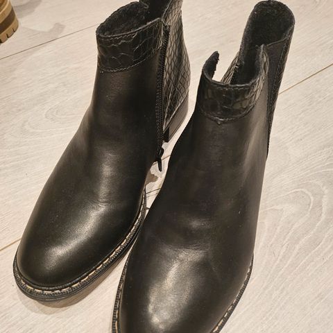 Dr. Martens støvler i størrelse 37, svart farge, med innvendig fôr. Støvlene har elastiske sidepaneler for enkel på- og avkledning og en slitesterk såle med godt grep. Materialet er skinn, og de egner seg til bruk i kaldere vær på grunn av det isolerende foret.