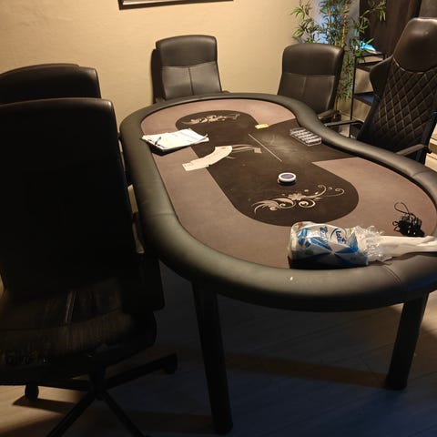 En epoke er over. Jeg har avviklet mitt pokerlag og må derfor selge unna et par ting - bl.a et unikt pokerbord kjøpt fra Pokerevents.no for en rekke år tilbake. Som man ser på bildene så er pokerbordet utstyrt med runde ben - noe som man ikke ser så ofte. Jeg har også selv installert koppholdere i tre som kan sveives inn og ut under bordplaten - 8 stk i antallet. Det er også USB-lader på hvert sete (8 stk). Under bordplaten er det 4 stk lys med bevegelse-sensor. Disse går på vanlige batterier. Om du ønsker å bruke bordet til andre ting - f.eks kjøkkenbord eller beerpongbord ;-) så har jeg også laget en bordplate i kryssfiner sammen med vannavstøtende pokerduk. Denne kan enkelt flyttes av og på og er tilpasset bordet. Veier et par kilo. Denne er ikke pen som synlig på bildene. Den har gjort sin jobb med å beskytte bordet for å si det sånn.