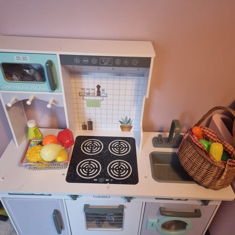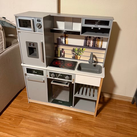 Et fint lekekjøkken i tre fra Miele. Dette morsomme lekekjøkkenet passer perfekt inn i miniatyrhjemmet. Kjøkkenet er utstyrt med en komfyr med stekeplater, mikrobølgeovn, oppvaskkum og hyller. Det har også lyd- og lysfunksjoner, som gjør lekingen enda mer realistisk.