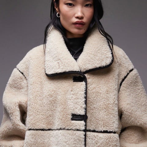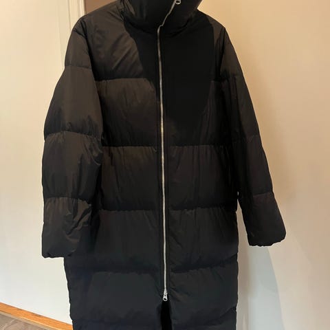 Svart kåpe i imitert saueskinn fra Arket. Fôret hele veien inni, høy hals og hette som gjør den ganske varm. Lite brukt!