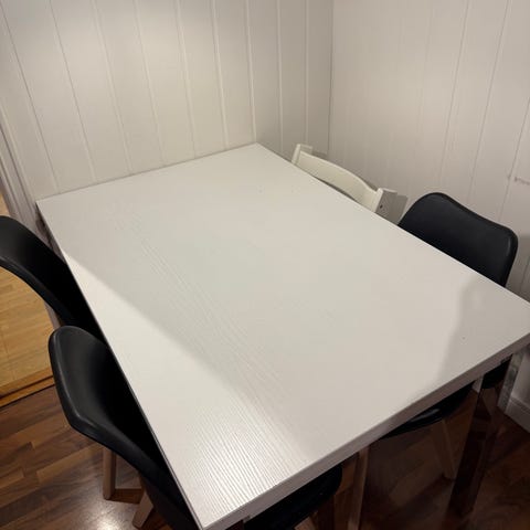 Spisebord fra Skeidar i med diameter 128. Se bilde av to merker. Fire stoler følger med, disse fra Jysk. Kjøpt i 2020.