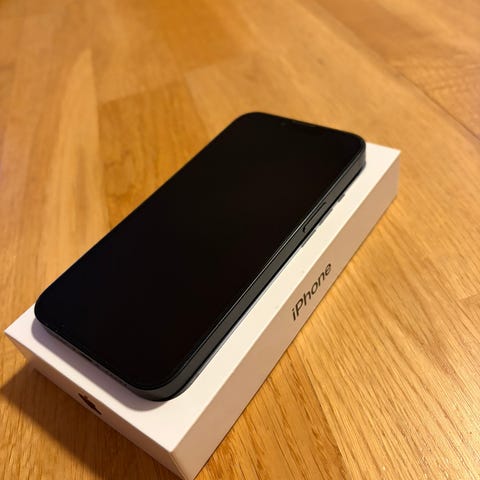iPhone 14 svart med deksel og ladekabel
