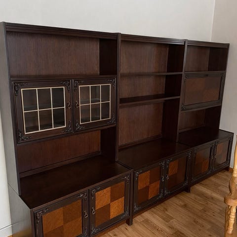 Selger en stor og solid eldre seksjon i heltre med vitrineskap, hyller og god oppbevaringsplass. Klassisk utførelse som passer godt i stue eller spisestue.