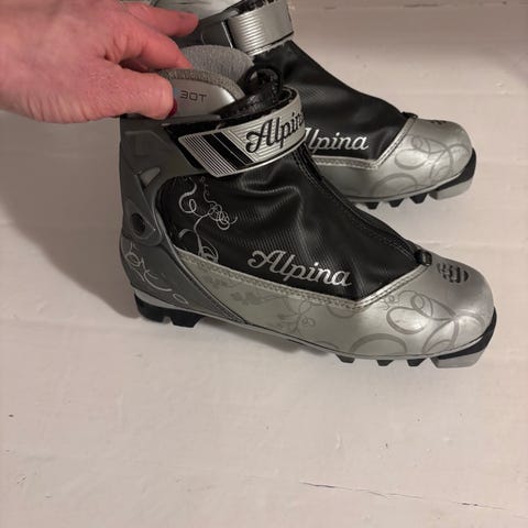 Selger Alpina racing skistøvler str.38. Støvlene har stått noen år uten bruk og kunstskinnet på foringen har begynt å flasse av (kommer tydelig frem på bildet).