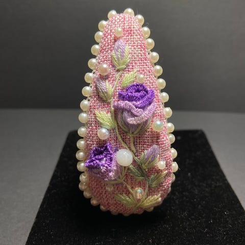 Alt er laget for hånd. Det tar rundt to–tre dager å lage én. Hver blomst, hvert blad og hver lille perle er sydd på for hånd, sting for sting, så det kan være noen små uperfektheter. Jeg har laget flere enn jeg selv trenger, så nå vil jeg selge dem til dere som, akkurat som meg, liker broderi.