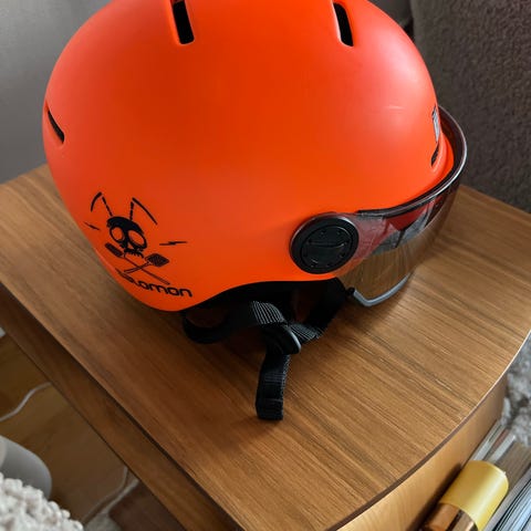 Hjelmen er med kvalitet fra Salomon med festet visir på, som gjør det praktisk og enkelt i bruk for barn.