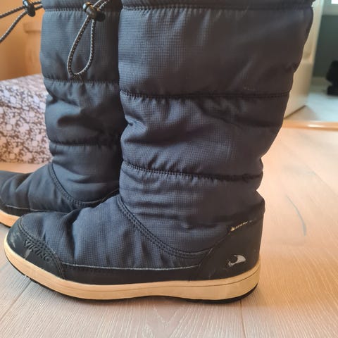 Viking vintersko str33. Skoene er svarte med borrelås for enkel justering og lukking. De har en slitesterk gummisåle med godt mønster for grep. Innvendig er skoene foret med mykt materiale for varme og komfort. Goretex. Lite brukt, her er det masse bruk igjen. Vi har hund, så det kan være noen hundehår jeg ikke har fått bort fra foret. Bør derfor ikke kjøpes av noen som er allergisk.