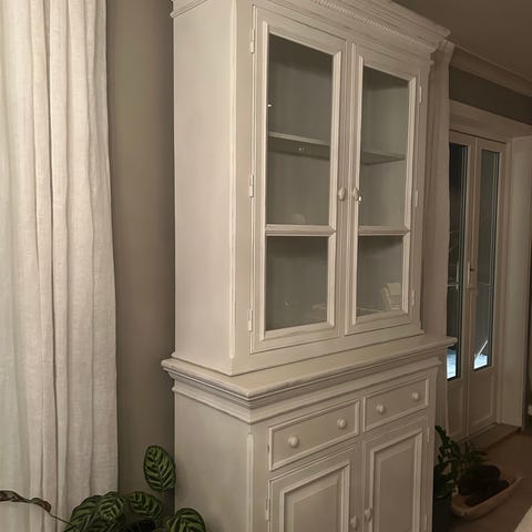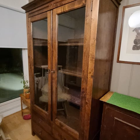Nett lite vitrineskap i mørkt heltre. 4 hyller med romslig plass, og glass på tre sider. Mål (H x B x D): 170 x 65 x 37. Rustikk stil, men ingen skadet eller merker. Må hentes.