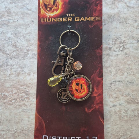The Hunger Games Mockingjay pin med motiv av en fugl med utstrakte vinger på en bakgrunn av flammer. Produktet er laget i Kina og beregnet for aldersgruppen 13 år og oppover. Pinen er fra 2015.