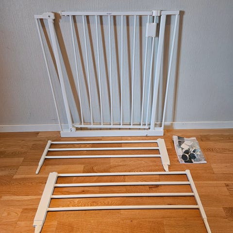 Selger sikkerhetsgrinda vår da barna stort sett har sluttet å ramle ned trappa. Denne monteres med medfølgende nøkkel, og holdes på plass med spenn, ingen skruer og hull i veggen nødvendig.