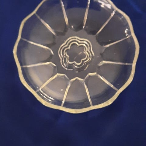 Det er små tallerkener i porselen fra Figgjo Flint (Stavangerflint), med blomsterdekor og sølvfarget kant, produsert i Norge. Populært på 50- og 60-tallet. Gullkanten er det, men er slitt.
