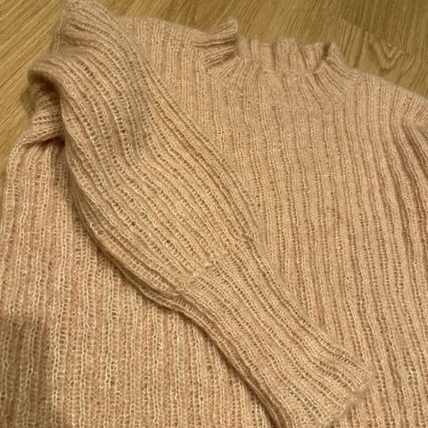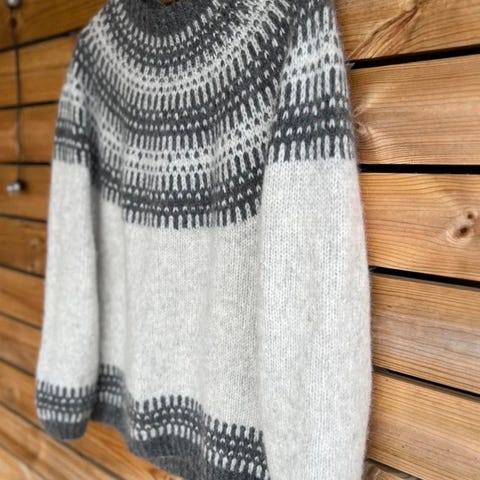 Nydelig håndstrikket genser i garn fra Rauma, lamull og alpakka lin. Varm genser som samtidig ikke er så tung. Isydde ermer. Flettestrikk. Pent arbeid. Og pent brukt.