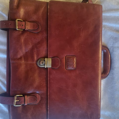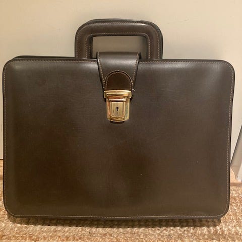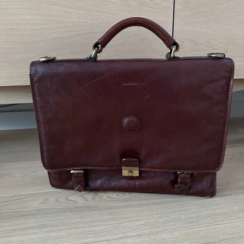 Stilren klassisk brun skinnveske/dokumentmappe fra 60-/70-tallet. Pent brukt i presteembete i Nesbyen.