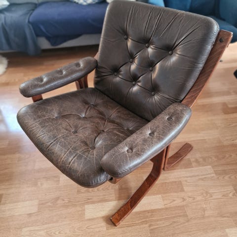 Ørelappstol i skinn, div «sår» for reparasjon eller ignorering, veldig stødig ellers.