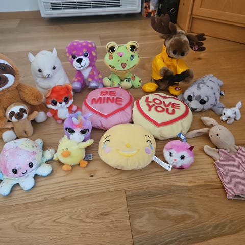 Heklet hvit rotte med rosa detaljer. Jeg har heklet den med chenille garn. Har plast øyne så er ikke for barn under 3 år. Lengde cirka 34 cm og bredde cirka 10 cm.