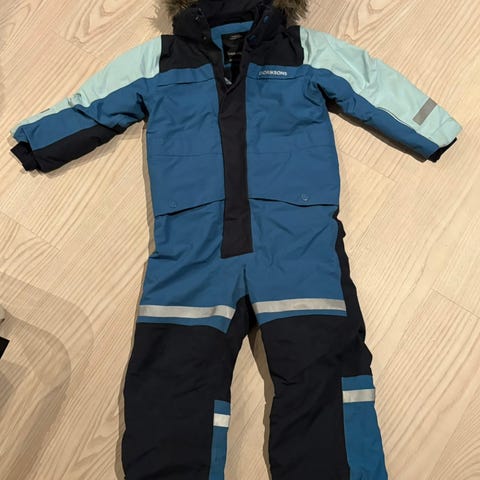 Pent brukt vinterdress i størrelse 90 cm, men litt stor i størrelsen. Mørk blå. Ingen hull.