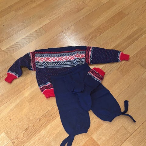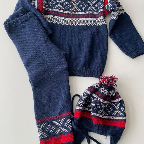 Selger et hjemmestrikka ullsett med Marius mønster. Genser, bukse, lue og 2 stk ullsokker.