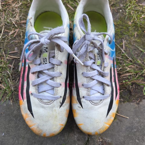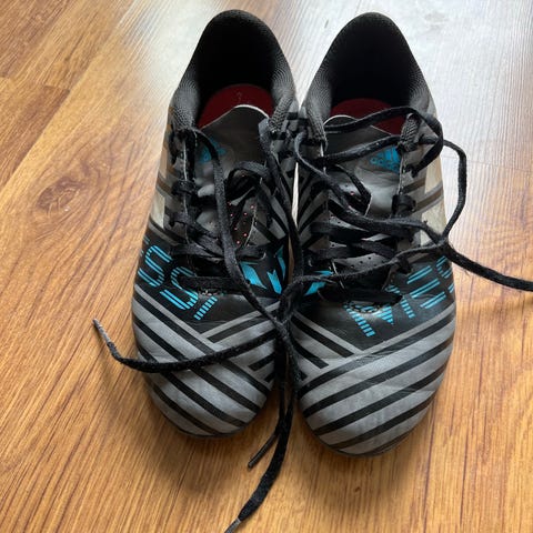Adidas Messi fotballsko i blå farge for barn. Skoene har knotter under sålen for bruk på gressbaner og kunstgress. Materialet er syntetisk med detaljer i lys blå og gull.