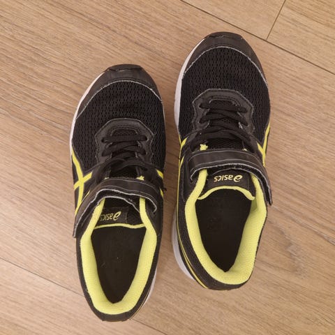 Joggesko fra Asics i str 34,5. Borrelås slik at det er enkelt for barnet å ta dem av/på selv. Brukt av ett barn til gym/fritidsaktivitet. Jeg har lagt ved bilde av sålen/undersiden. Gode sko som sitter godt på foten. Vi har vært veldig fornøyd med disse, og har hatt flere slike joggesko, selger også et par i str 33. Dyrefritt og røykfritt hjem. Jeg kan sende med Fiks ferdig. Selger også annet til barn; se gjerne også mine andre annonser.