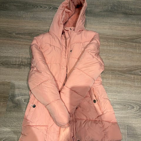 Veldig fin dus rosa jakke, dun/fjær isolasjon. Rekker til ned på låret. Har fuskepels som er avtagbar, og hette er også det.