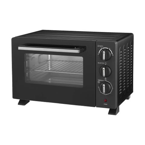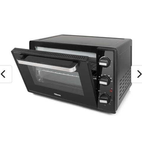 Fin, smart liten bordmodell av en stekeovn med liten panne og rist i ovnen. Varmer småretter kjapt og enkelt.