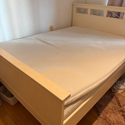 Gis bort uten overmadrass. Sengen er nesten aldri brukt. Kjøp en egen overmadrass, så har man en helt ny seng. Må hentes.