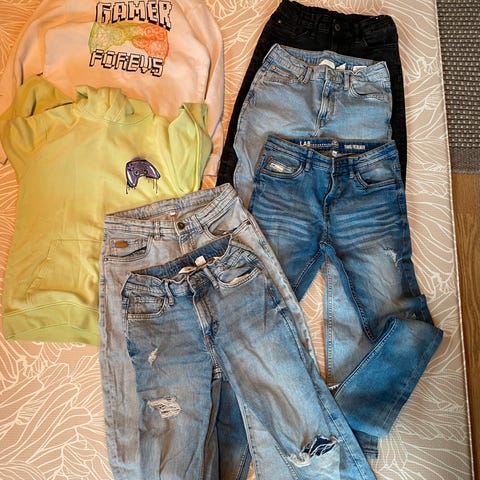 Nøye utvalgt av sønnen selv, og alle plagg kjøpt nytt av oss. Pent brukte klær. Den hvite hettegenseren har noen få bittesmå grå prikker her og der så jeg når jeg tok bildene nå, så ikke forsøkt vasket bort. Pakken inneholder :