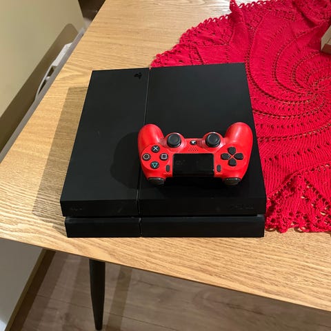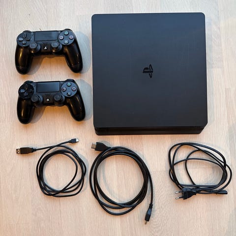 Sony Playstation 4 spillkonsoll. Svart farge, kompakt design. Egnet for spilling på TV med et bredt utvalg av spill tilgjengelig for denne konsollen.