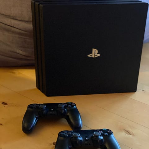 Sony Playstation 4 spillkonsoll i svart farge. Konsollen leveres med to trådløse kontrollere. Alt i god og fin stand. Egne bilder kommer/ kan sendes på etterspørsel. Kom gjerne med bud!
