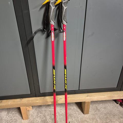 Swix alpinstaver med lengde på 85 cm. Stavene er hvite med svarte håndtak og stropper.