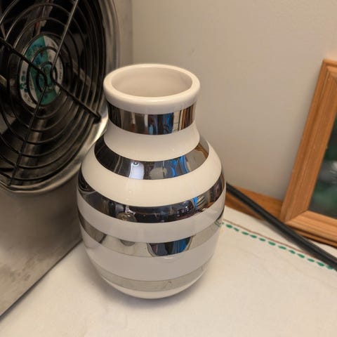 Kähler Omaggio Vase med stripemønster i hvitt og sølv. Ubrukt, str 12,5 cm.