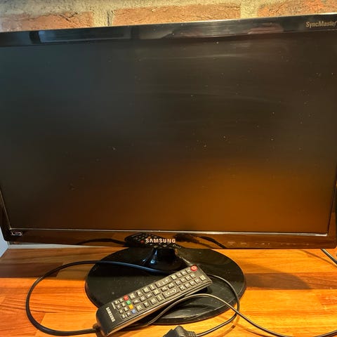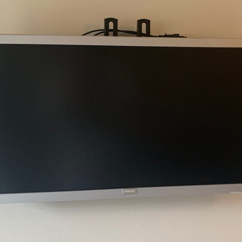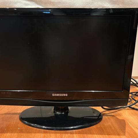 En 24 tommer skjerm med en HDMI port og en RGB port, Den kommer med lader