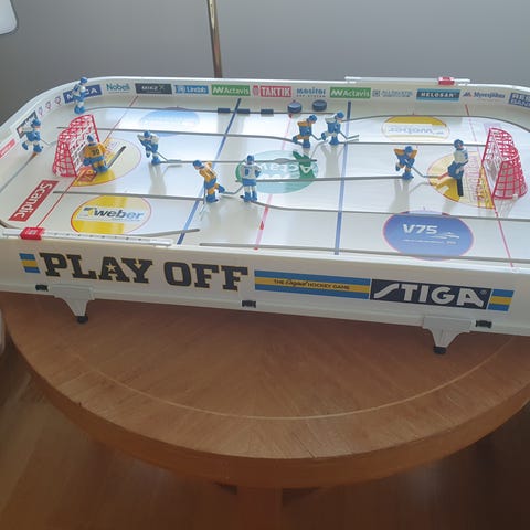 Stiga Play Off Hockey Game er et bordspill som simulerer ishockey. Spillet har grafikk som viser ishockeyspillere og en spilleflate som etterligner en hockeybane. Passer for bruk som underholdning og spillaktivitet.