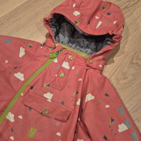 Knall fin kattnakken vinterregndress i str 110. Pent brukt med bruksmerker.