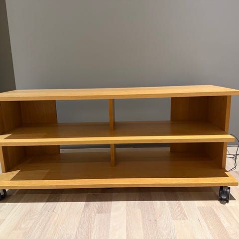 IKEA Benno TV-benk i svart farge med trestruktur. Møbelet har hjul for enkel flytting og har to åpne hyller for oppbevaring. Nederste hylle stikker litt mer frem enn toppen. God stand. Noen små hakk, men de er ikke veldig synlige. Perfekt for tv mellom 40 og 55 tommer.