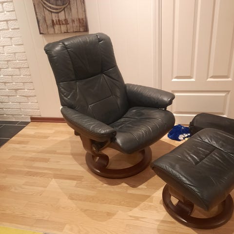 Lenestol i svart skinn. God sittekomfort, og i god stand.