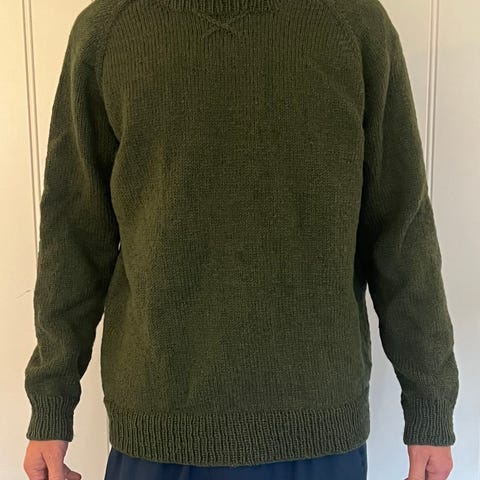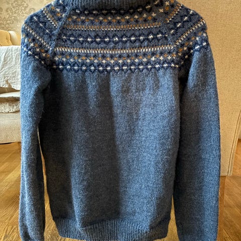 Selger en håndstrikket ullgenser i klassisk nordisk mønster.