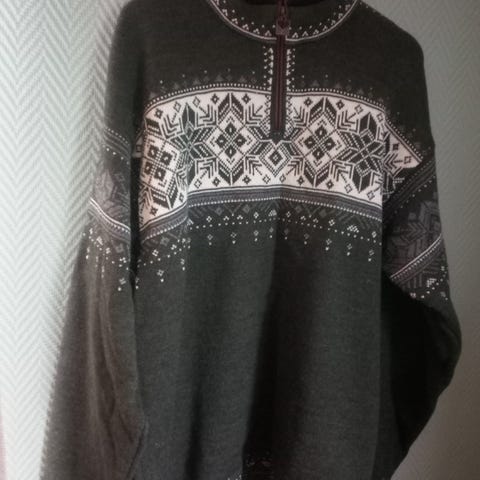 Dale of Norway ullgenser i størrelse L, grå farge. Har ikke tagg, men er kun prøvd, så er sin ny. Genseren er laget av 100% merino-ull og har tradisjonelt mønster rundt halsen, og logo på venstre erm. Vil si den er normal i størrelsen. Jeg er 184 og rundt 84 kg.
