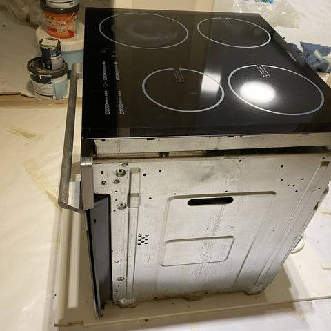 kjøleskap er fastmontert samt komfyr og induksjonstopp.