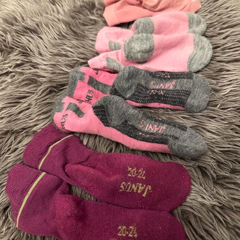Alle ble kjøpt nye og pent brukt av ett barn. Ingen hull eller flekker. Veldig lite med nupper. Antiskli på de bordo er nesten vekke.
