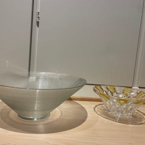 Gir bort salatbestikk, to sett. Ett sett bredt med grove gafler, ett smalt og langt med kvadratisk 'skje'.