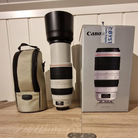 Canon EF 100-400mm L- IS zoom linse 1: 4,5-5,6, med UV filter, solblender og veske.