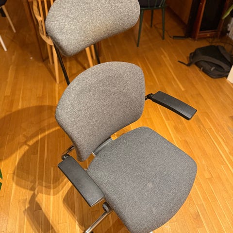 Detter er i utgangspungtet en dyr og god stol. Den har forskjellige skader medn fungerer delvis fortsatt. Hjulet er knekt og byttet ut med en pinne