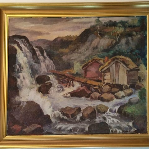 Bildet har god størrelse, harmonisk fargebruk og fremstår som et klassisk norsk landskap.